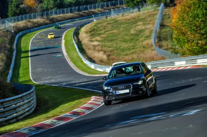 Following picture from iRacing development shows a whole track with all the cloud points of every survey already georeferenced. Expanded picture is used to understand those black circles. These are different stations where equipment was placed. Remember a LSS scan vertically only 270º to 300º degrees and it is impossible to scan its own position. That fact leaves a black lagoon on the ground without being scanned. Also you can see cloud is more dense near to these “lakes” as we already explained. As we push away from the station points this density decrease and elements are reflected with less resolution. This is how iRacing scanned tracks.
