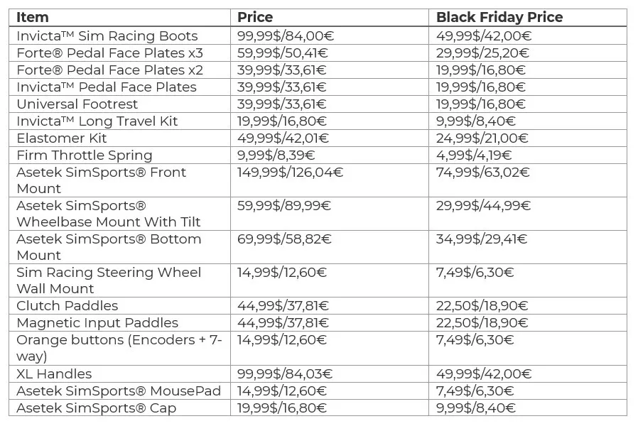 The star of this black Friday is our Asetek SimSports® Pagani Huayra R Sim Racing Pedals with 25% off, taking the price down to 749.99$/630,24€ from the original 999,99$/840,33€, excl. VAT. They will be available for this price the whole black week ( 20-26.11.2023 )!