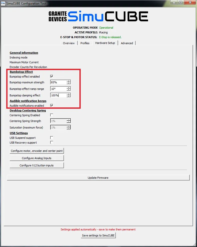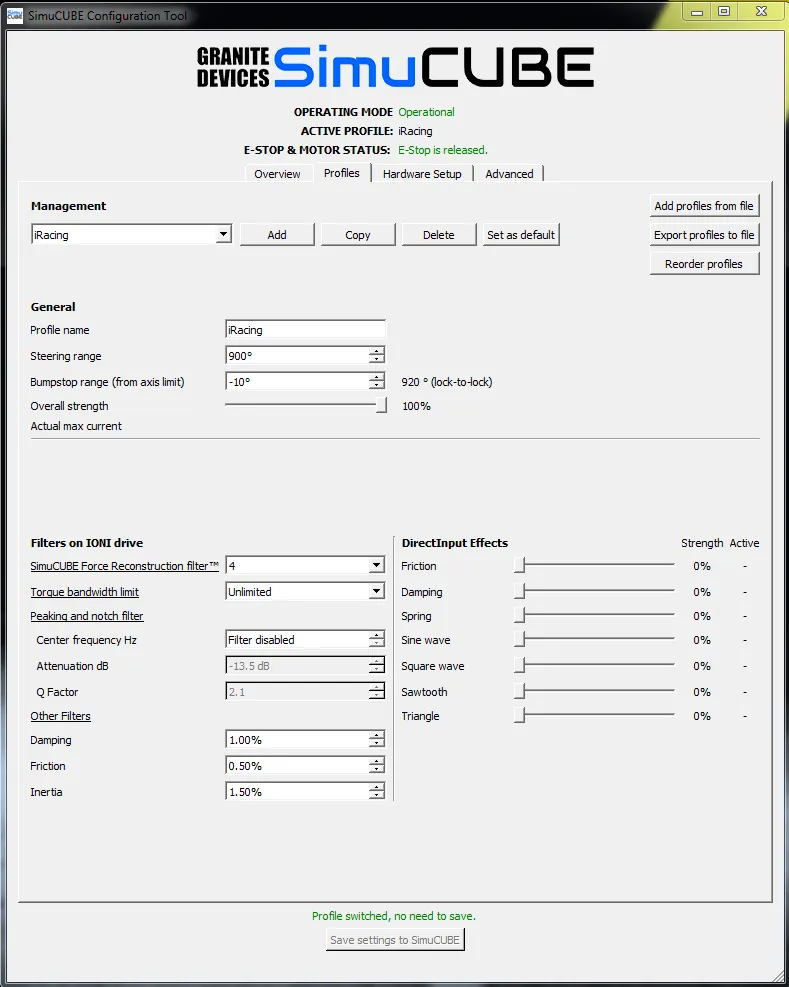 2.- In the SimuCUBE Software in the Profiles tab, select the following values: