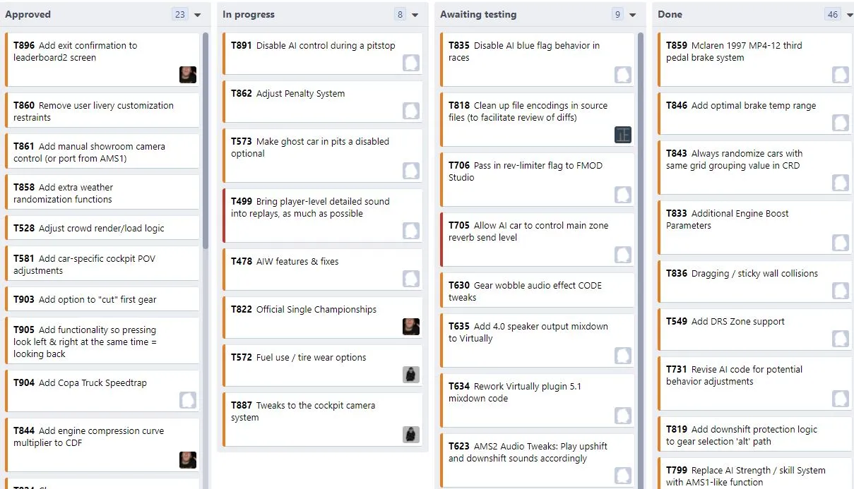To give a better clue into this ongoing process, below you have the unusual preview of what our code taskboard looks like, giving you a glimpese into the various tasks we have worked on, are currently working or will come to work in the near future – there are similar boards for every development front in the game, and they are constantly expanding not only to include the developments necessary to fulfill our own plans, but also to attend the more common requests we gather in any of the ongoing feedback topics here in the forum and in other commuinties: