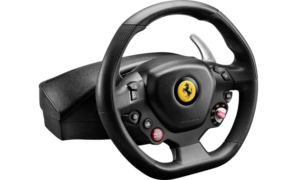 Let’s start with something that’s not just a toy that will last us two weeks. This Ferrari 488 GTB Edition T80 doesn’t have FFB (Force Feedback), but it does have a linear resistance and centering method so that we at least don’t feel like we’re turning something randomly. It’s lightweight, a good size, and offers 240 degrees of rotation to start in a very basic way in some car games. Some Playstation 5 games also recognize it.