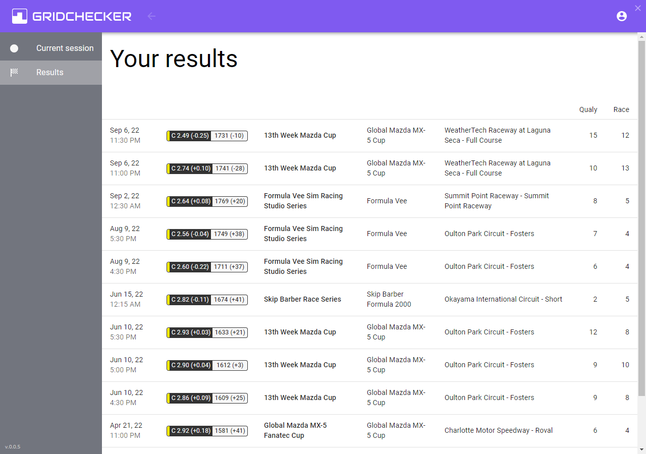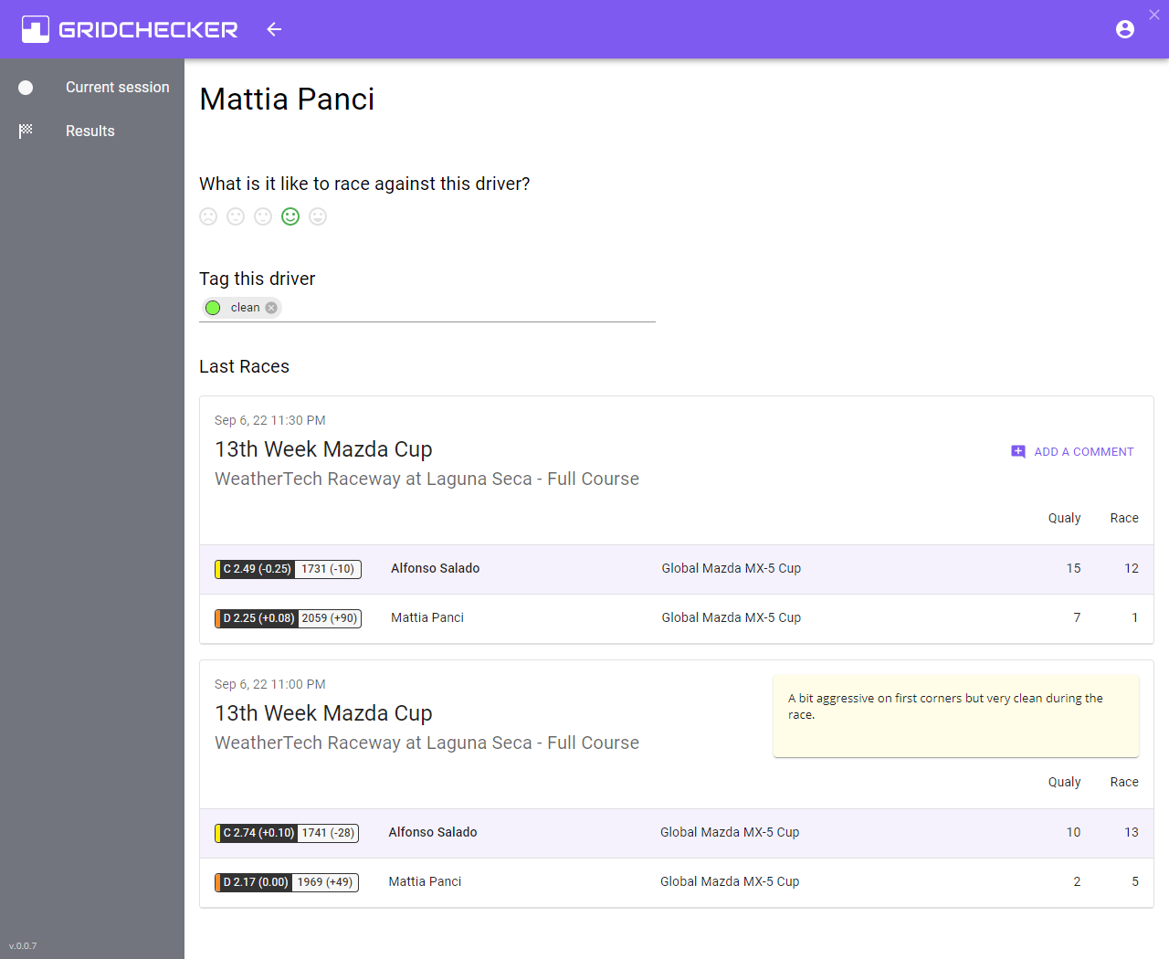 Furthermore, we can see in which other sessions we have met them previously, and if we leave a comment, we can recall what happened. At the same time, we can see which drivers are in our current session (if we have one) and who we have previously crossed paths with.