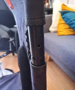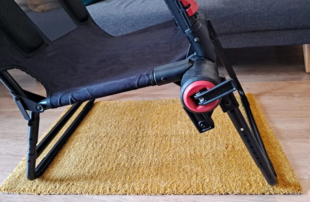 So, what about stability? This cockpit passes the test with merits. As I said, the chair’s appearance reminded me of those typical beach hammocks, but the resemblance does not go beyond aesthetics. And this is noticeable from the moment you sit down. The bars did not make any creaks, the steering wheel bar is stable when turning and making wheel corrections, and the pedal support also remains firm during braking, which is when we apply the maximum force on the pedal board. Two notes to improve the stiffness of this cockpit. First, don’t forget to tighten the belt between the front and rear legs of the seat. The assembly video does not include this part, but it does appear in the paper assembly manual, and it improves the stability of the seat especially as the weight of the user increases. And second, tighten the velcro strap between the seat and the steering wheel bar before closing the base of the steering wheel over you to fix it more firmly.