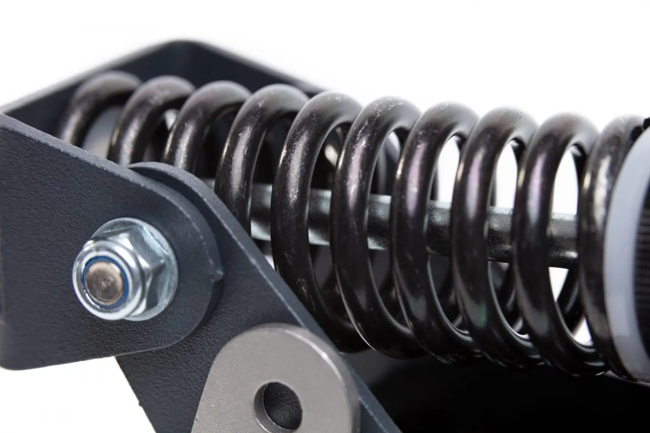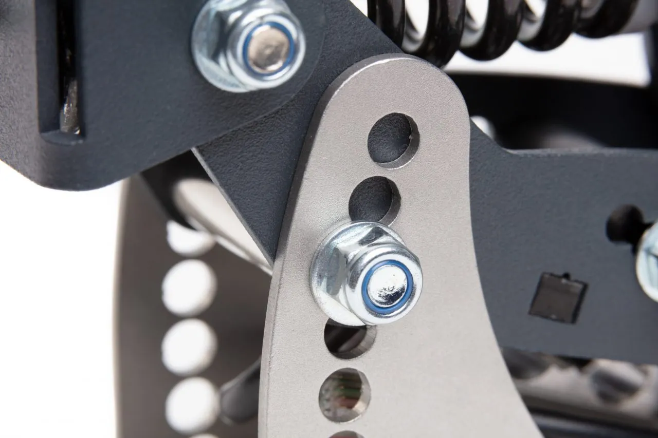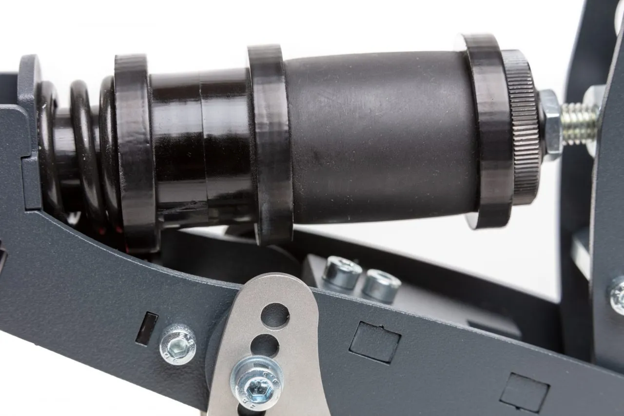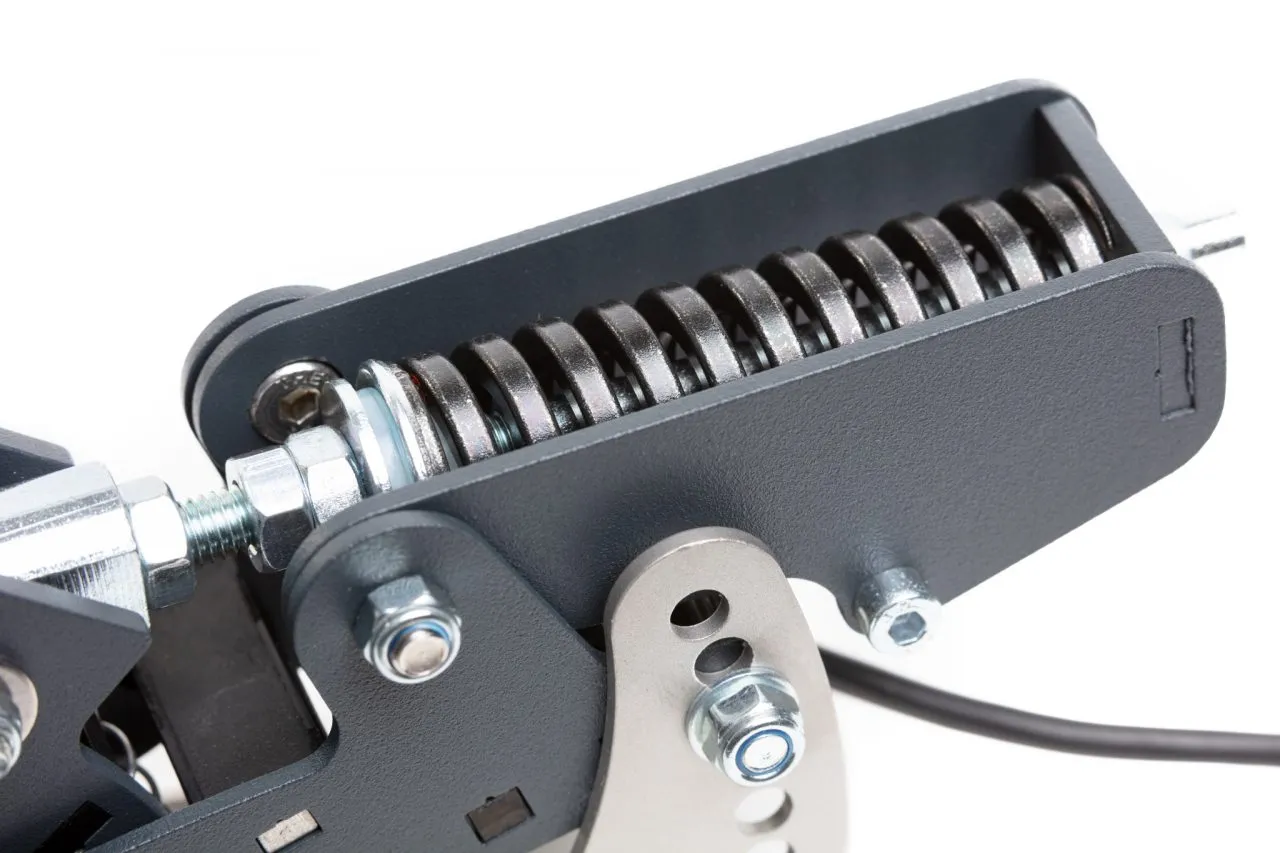 - The dual stage brake system consists of an adjustable initial coil spring, simulating the pad to disc gap, and progressive rubber springs. The pedal firmness is adjusted by selecting from 6 different rubber stack heights. The pedal angle and pedal height can also be adjusted. With up to 65kg (143lbs) of maximum brake force this brake pedal caters both for simracers who like to apply significant force while braking but also for racers who like much lower operating forces.
