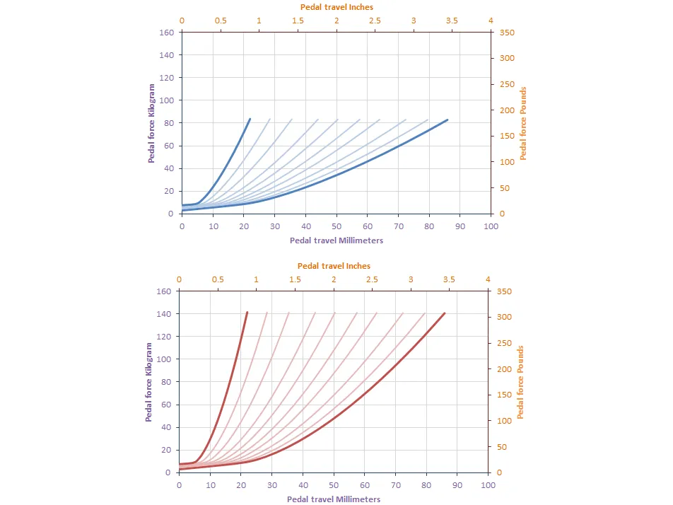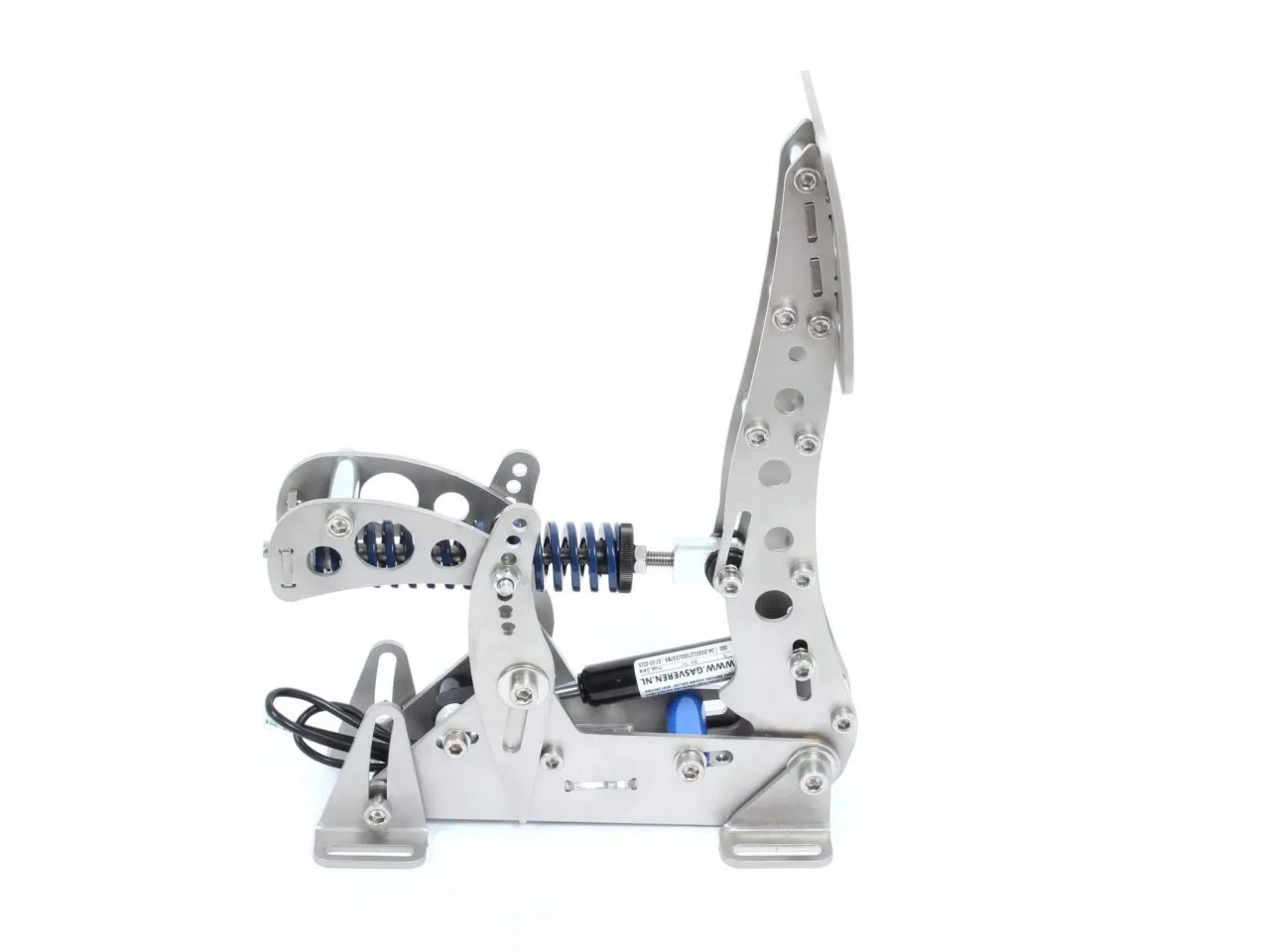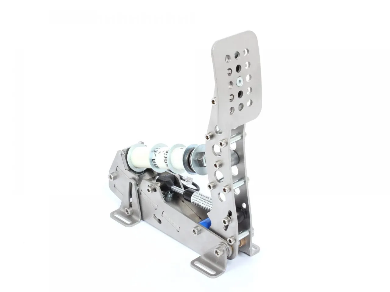 - The dual stage brake system consists of an initial coil spring, simulating the pad to disc gap and progressive rubber springs. The pedal firmness is adjusted by selecting from 10 different rubber stack heights. With 136kg or 300lbs max force, this pedal easily requires 36x more effort than regular consumer grade brake pedals. Braking using muscle memory improves accuracy and consistency.