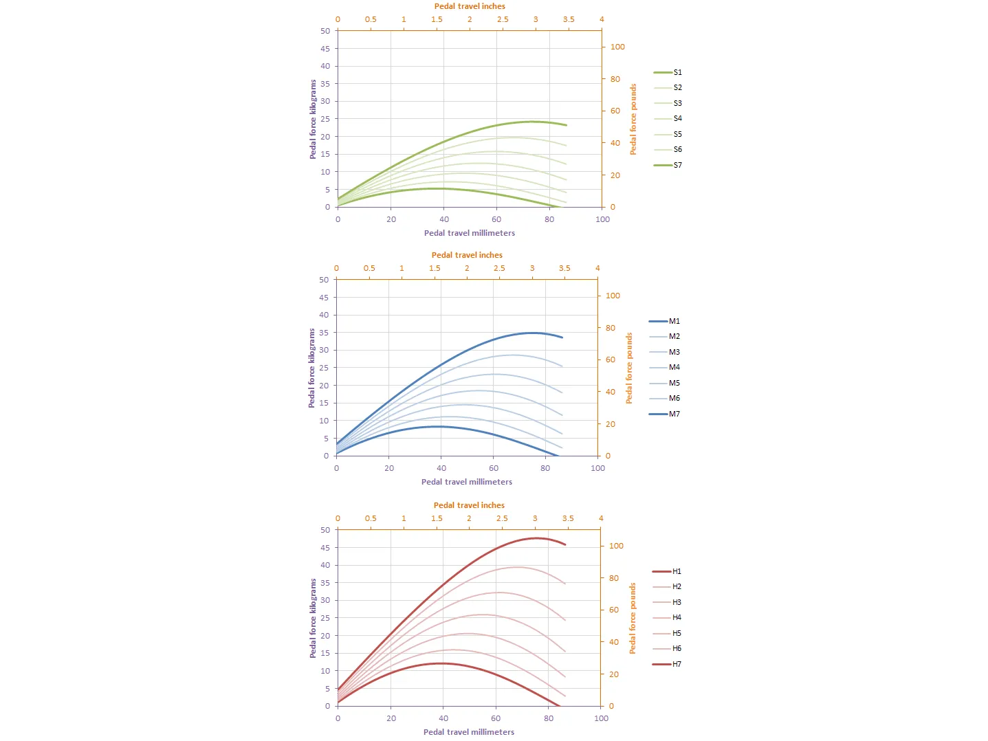 - The pedals are strong, stiff, compact and durable. Mathematical models were made to calculate pedal travel and operating force, predicting with great accuracy how each pedal feels in all of its many different configurations.