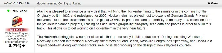 The pandemic and the current situation has left many work teams with a major problem as they are unable to travel. Circuit scanning is important to the people on iRacing and as we have seen, Hockenheim will be the first to be relied upon to delegate that responsibility and rely on third party data. This won’t be the only case we’ll encounter for sure, but at least we know that other circuits coming into development will be closer to what we’re used to.