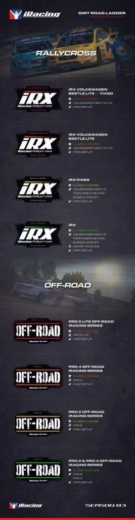 On the iRacing Off-Road side of things, the Pro 2 Lite will continue to hold its place in Rookie events, while fixed-setup events for the Pro 4 Truck (Class D) and Pro 2 Truck (Class C) will take up the next spots on the ladder. Open-setup racing for both the Pro 4 and Pro 2 will take place at the Class B level.