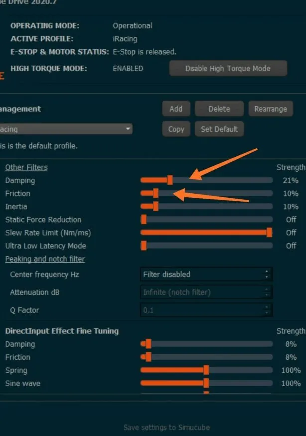 Having damping that high isn’t beneficial, because you’re losing details in the FFB, which are crucial especially in iRacing since you’re need to drive much more precise to nurse the tyres compared to other titles.