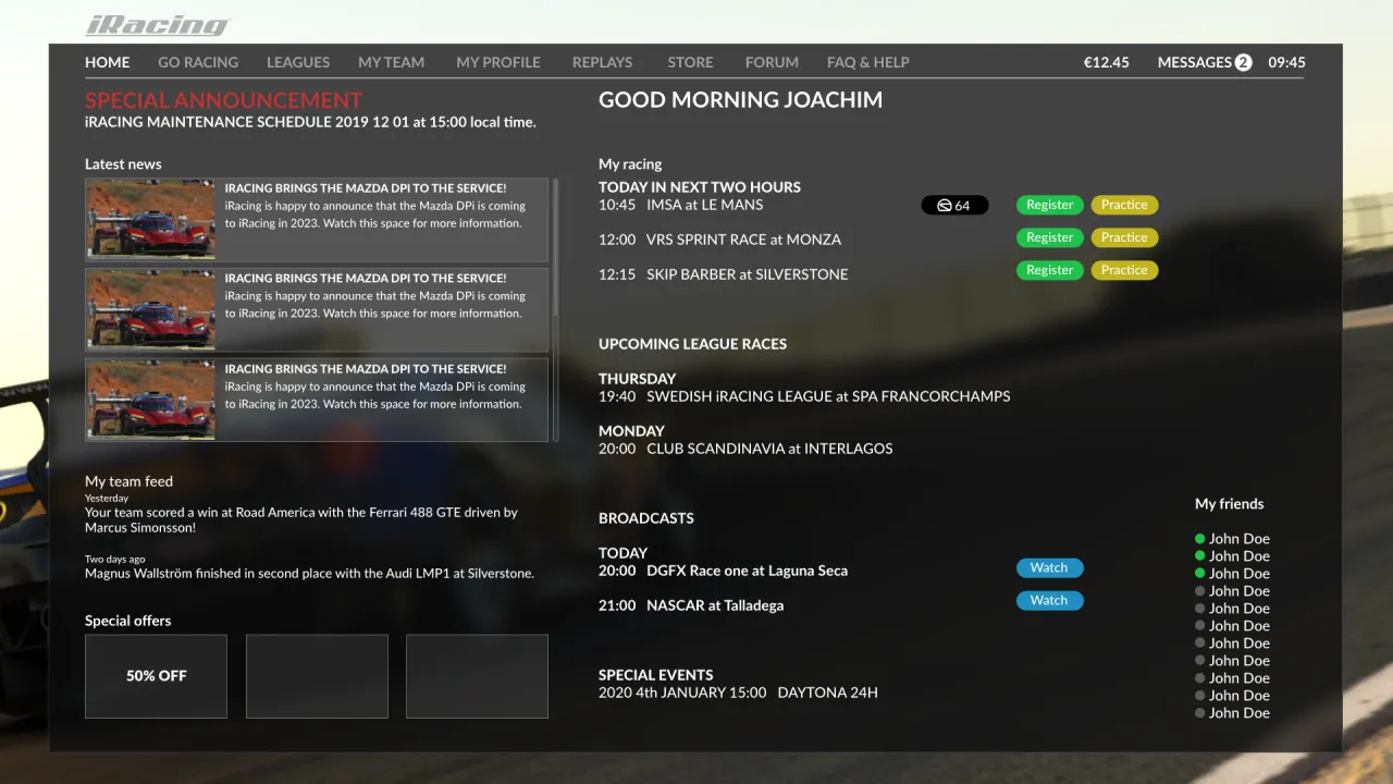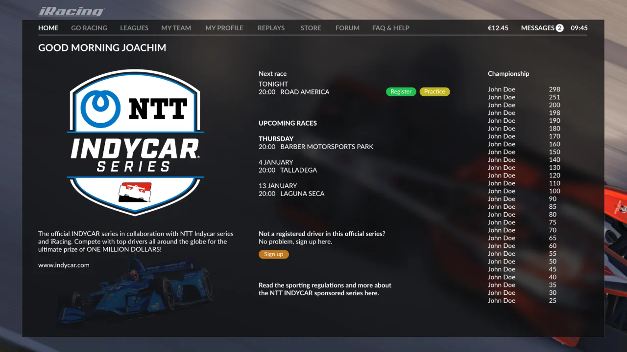 Here is the most important place in the UI. Your personalised home screen. It should be highly configurable showing only the stuff you want to see and race. Look at it as a “to do list” for the racing today. The usual official racing and the next league race and other news are presented here. And all can be joined with one click.