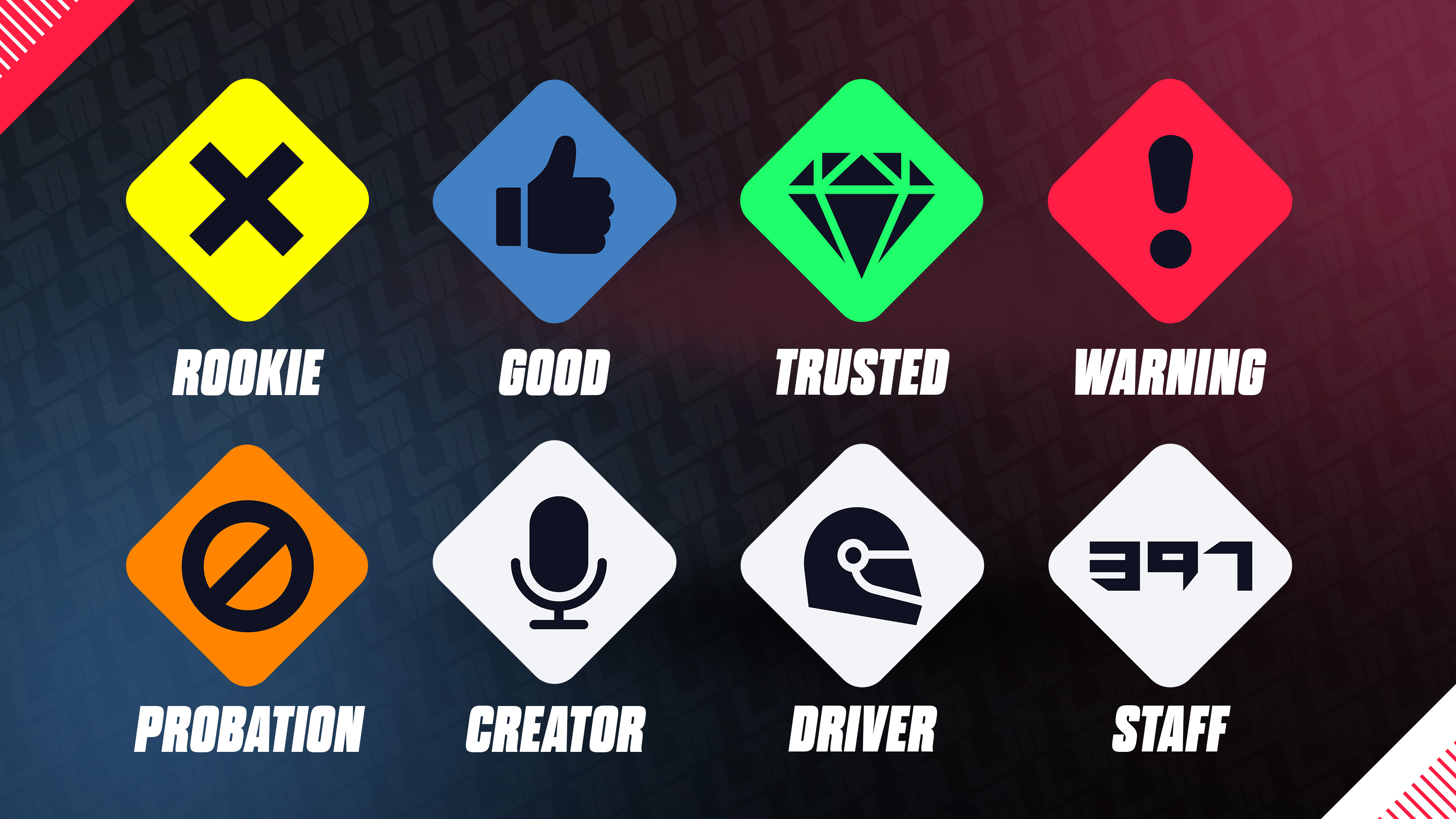 For players first 10 races they will receive a rookie badge whilst we gather data. After that we’ll give the driver one of three badges: