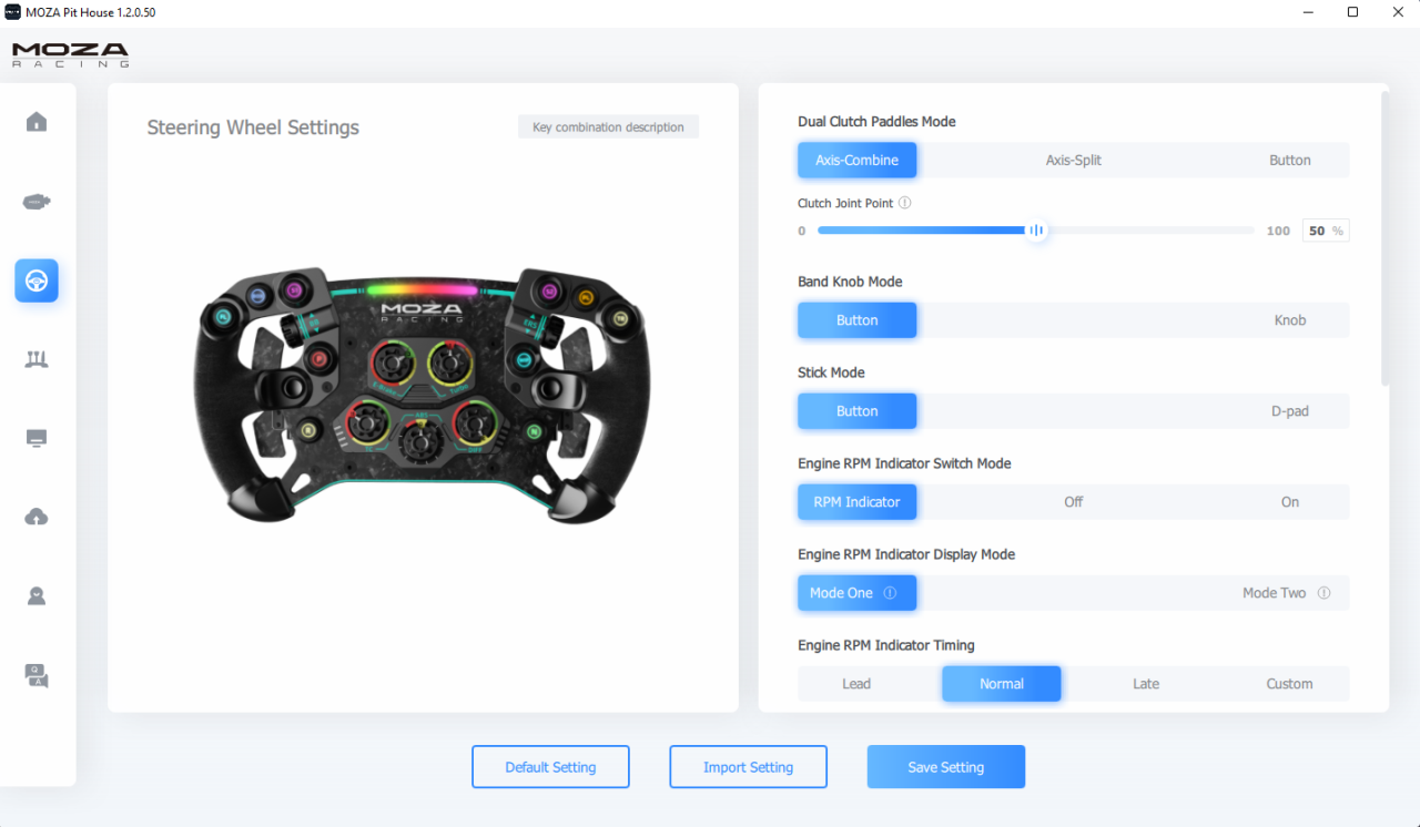 In the unique wheel configuration screen found in the software, we can select the operating mode of the clutch paddles (as a single paddle, two independent paddles or buttons), 4 or 8-way mode on the joysticks, LED brightness configuration and RPM LED strip illumination configuration.