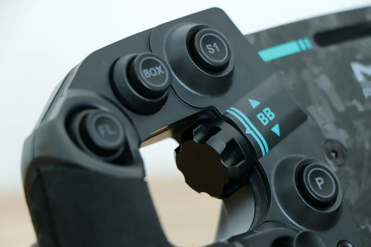 The first thing that strikes you when you open the box is its robustness. It is not a particularly heavy rim, but it conveys a sense of high quality. The steering wheel measures 300 mm in diameter and has Alcantara grips (made in Italy), while the button box is made of 3 mm thick carbon fiber. It has a dual set of paddles, allowing us to control not only the gears but also the clutch, and it is finished in carbon fiber of the same thickness as the button box. Ten of the buttons on this wheel have LED illumination, including two thumb rotaries, five front rotaries, and two joysticks. There are no unusual switches because, while these two joysticks are used as such, they have free movement and do not rotate.