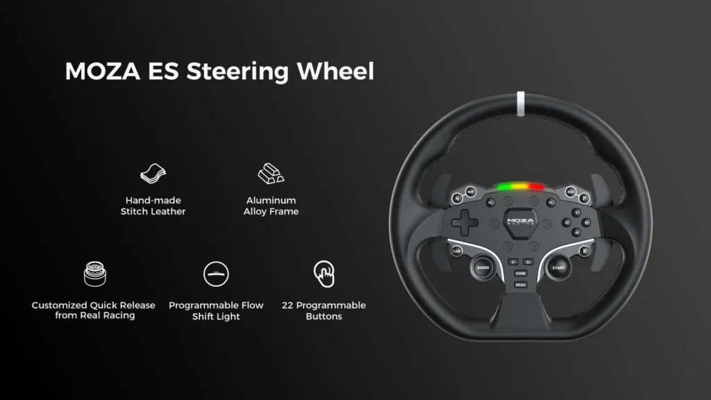 The R5 bundle comes with a new wheel from MOZA, the ES. The ES wheel is a leather-rim wheel, sporting MOZA’s signature Flow lights, quick release system and configurable buttons through MOZA’s software suite, MOZA Pit House.