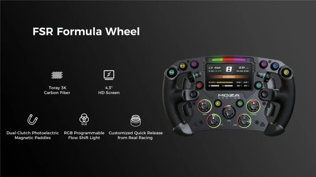 The Moza Racing FSR Formula Wheel is MOZA’s newest premium wheel. It expands on the success of the GS GT Wheel, with a full carbon fiber frame and 4.3” HD screen featuring 15 different UI interfaces. It is 280mm in width, and sports perforated leather for the grips.
