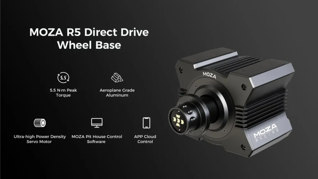 The R5 Wheelbase is MOZA’s newest entry-level direct drive wheelbase, with 5.5Nm of torque. It sports a similar, sleek black design to the R9, but with a smaller compact form.