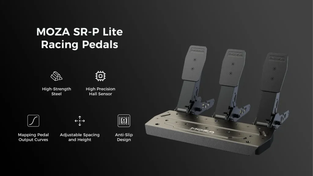 The bundle also includes a new set of pedals, the SR-P Lite Pedals. These are an all-steel, lightweight revision of MOZA’s SR-P pedals. The pedals still feature flexibility and adjustability, minus the SR-P load cell brake system.