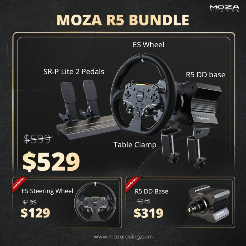 - The Moza Racing R5 bundle is available at a reduced price of $529 (previously $599).