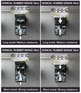 - Brake pedal: 15-25 kg, according to your preference (with Conical Rubber Brake Mod)