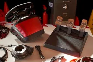 Racing wheel, pedal set, Turbo Power power supply, attachment system, user manual and consumer warranty information.